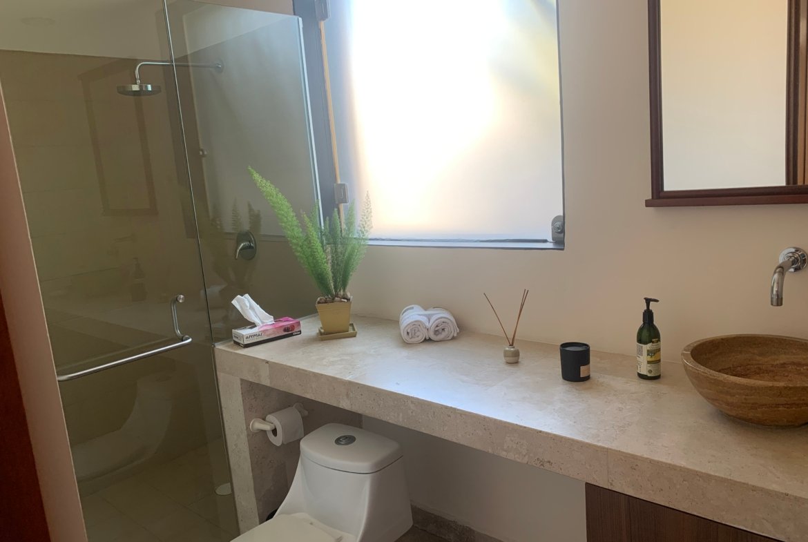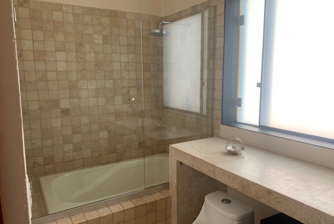 - Baños en mármol con canceles de cristal templado y herrajes importados.
