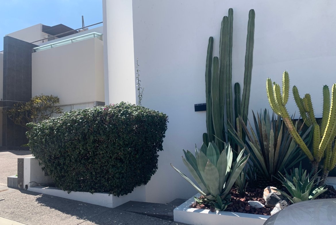 - Jardín con pasto, plantas semidesérticas y fuente con bomba.